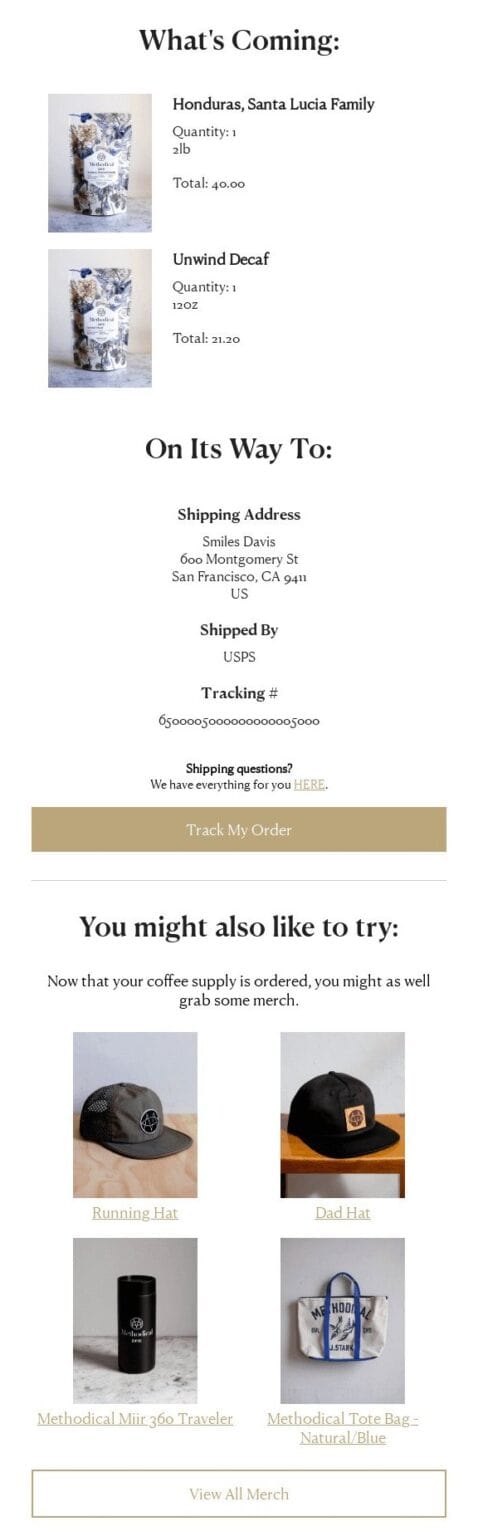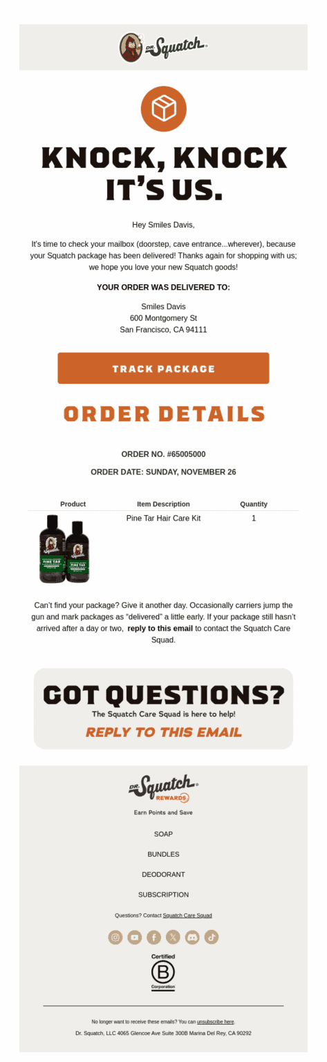In the example below, the email reconfirms the address that the order has been delivered to and features a ‘track package’ button that gives the customer more information about the delivery (including where the package has been left if no one was home). At the bottom of the email, the brand emphasises that customers can reply to the email if they have any questions about their order, which is great for making them feel valued and building brand loyalty.