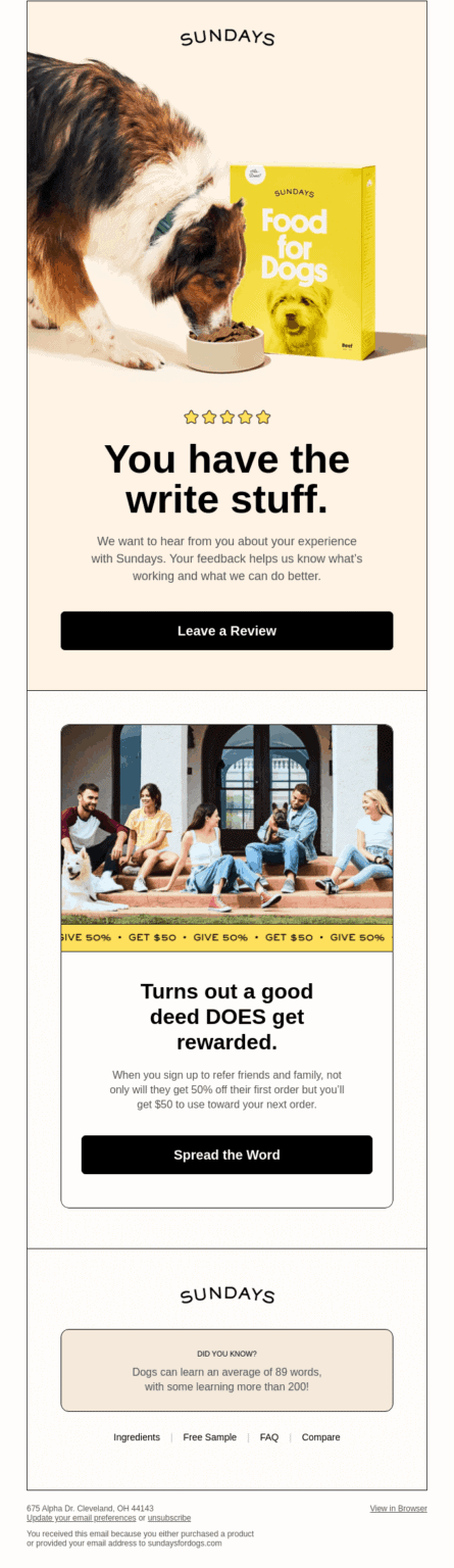 In this simple yet effective example, customers are not only encouraged to leave a review, but are also encouraged to refer a friend to get money off their next purchase – a great incentive that’s likely to make them come back and convert them into loyal customers.