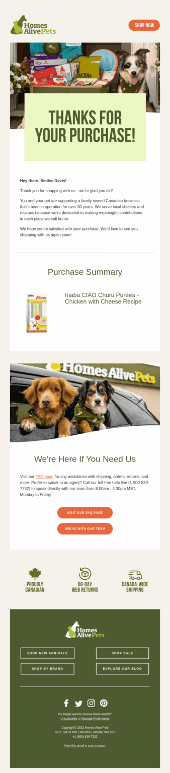 In this example, Homes Alive Pets not only thank their customers but also remind them of the advantages of purchasing from them (family owned, serving local shelters). Reiterating these points makes customers more likely to buy from them again.